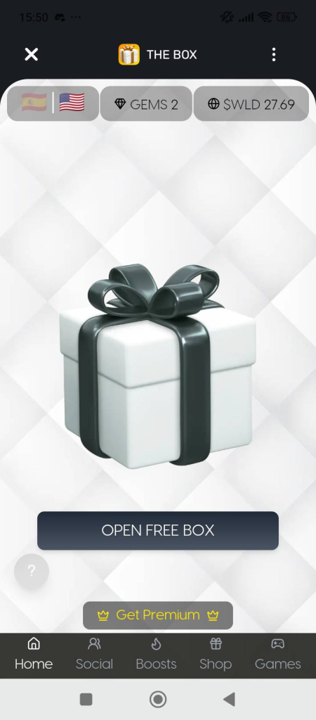 毎日開けられるプレゼントボックス。1日1回タップすることでランダムでWLDやポイントなどが当たる抽選機能。